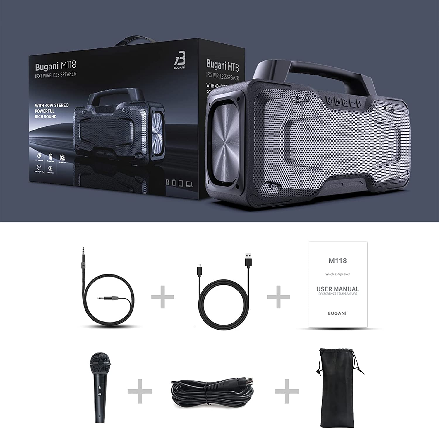 Bluetooth Speaker, BUGANI M118 Portable Bluetooth Speakers,50W High Volume,with Handheld Wired Mic Corded for Singing,IPX7 Waterproof,30H Playtime,10000mAh Power Bank,Parties,Outdoor